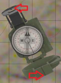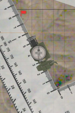 Zieht den Kompass auf der Karte in die Richtung eures Bezugspunktes. Durch Kimme und Korn des Kompasses erhaltet ihr ein Lineal (siehe rote Pfeile), welches ihr mit dem Lineal von der Karte kombinieren könnt.