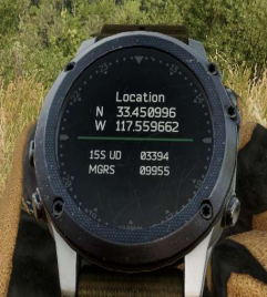 Mit drücken des Buchstabens O nehmt ihr die Garmin Uhr in die Hand. Wenn ihr die Garmin Uhr in der Hand habt könnt ihr mit der rechten Maustaste, diese fokussieren. Wenn ihr nun den Buchstaben R drückt, öffnen sich die Einstellungsmöglichkeiten. Rechts könnt ihr die Helligkeit einstellen und links andere Anzeigemodi (Uhr, Kompass und Koordinaten) auswählen. Stellt die Uhr auf Koordinaten (Location) ein. Die aktuellen Koordinaten werden unter dem grünen Strich angezeigt. Jeweils die ersten 3 Zahlen sind wichtig, da diese lediglich auf der Karte angezeigt werden.